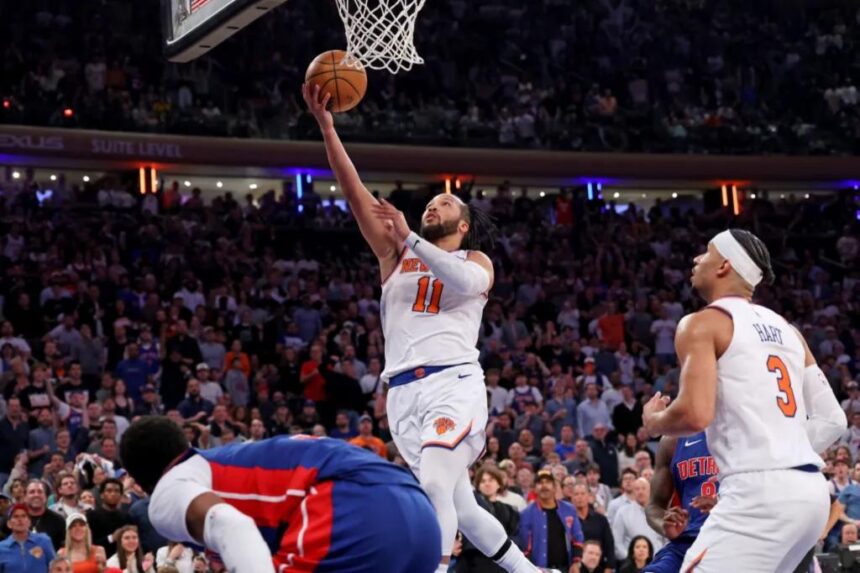 The New York Knicks guard, Jalen Brunson #11, increases the duration of the shooting in the last quarter. The New York Knicks defeated the Detroit Pistons 123-112 in game 1 of the NBA playoffs of 2025.